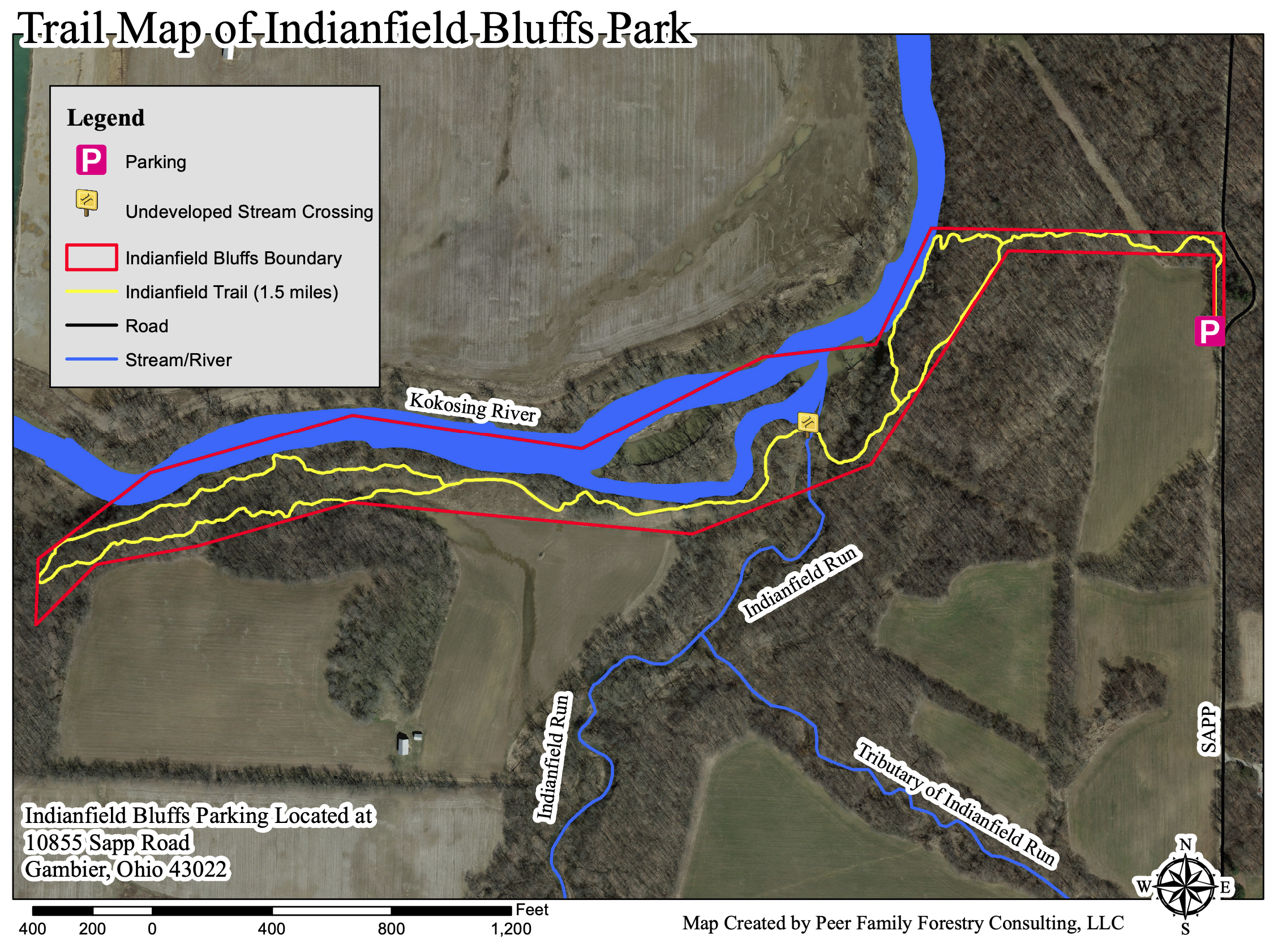 Named after the confluence of Indianfield Run with the Kokosing State Scenic River, Indianfield Bluffs Park features a 1.5 mile, double loop trail of steep gradients and switchbacks for hiking. Towering sycamores will greet the hiker on the westernmost loop. The 25.5 acre site contains sandstone bluffs, floodplains, wetlands, and an island. Reforestation efforts on the site have been completed in former cropland areas, with thousands of trees planted by Park District staff and East Knox High School students.