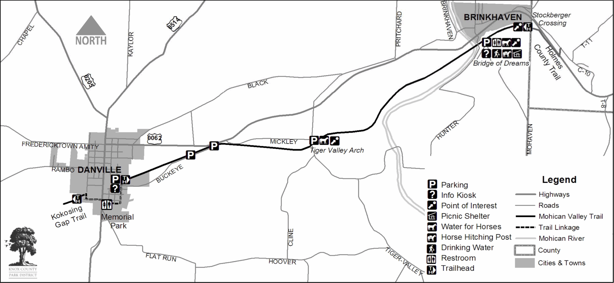Users of the Mohican Valley Trail can continue riding west, past Danville, on the Kokosing Gap Trail. Horses are not allowed on the Kokosing Gap Trail, however. Both trails are also components of the Ohio to Erie Trail. The planned 320-mile route, of which over 240 miles are complete and open for use, will eventually span Ohio from the shores of Lake Erie in Cleveland to the Ohio River in Cincinnati. There is paving underway to extend this trail several miles further east from the eastern endpoint. View a map that gives directions between the Mohican Valley and Kokosing Gap Trails in Danville. Users with horse trailers can park at the following locations;